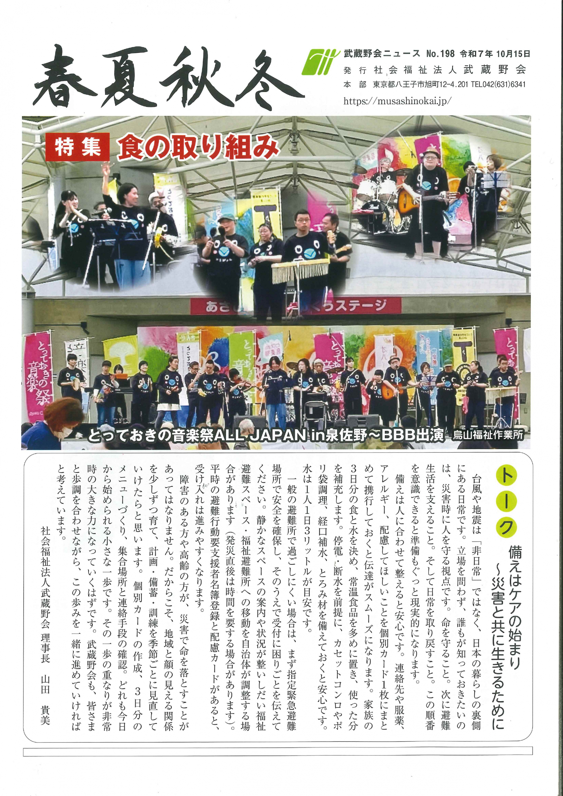 No.198 【特集】食の取り組み/トーク「備えはケアの始まり~災害と共に生きるために」 No.197 【特集】令和6年度事業・決算報告/トーク「逆転しない正義と福祉の姿勢」 No.196 令和7年度法人事業計画 理事長挨拶/トーク「萌ゆる新緑、希望の門出」 No.195 新年のごあいさつ フラワーアレンジメント教室 正月花と/トーク「日本被団協」のノーベル平和賞受賞を機に No.194 文化芸術特集「アートがいっぱい」/トーク「かがくいひろしの世界展」を見て No.193 令和5年度事業・決算報告/「無意識のバイアス」に抗う No.192 令和6年度事業計画(抜粋)/知性の特権化と社会的孤立 No.191 令和6年度 新年のごあいさつ/旧優生保護法をめぐる裁判に関する最高裁の統一判断に注目したい No.190 「未来へのステップ」拡大版ニュースラウンジ/トーク「全国社会福祉法人経営者大会に参加してこれからの福祉課題について考える」 No.189 令和5年度 社会福祉法人武蔵野会事業計画書(概要)/トーク「多くの若い人たちは他者への手助けをしたいと思っている」 No.188 新年のごあいさつ/トーク「「普通の人の思い」を再認識する」 No.187 特集「地域とともに歩む武蔵野会」コロナ禍での地域連携/トーク「多様性の尊重と確証バイアス